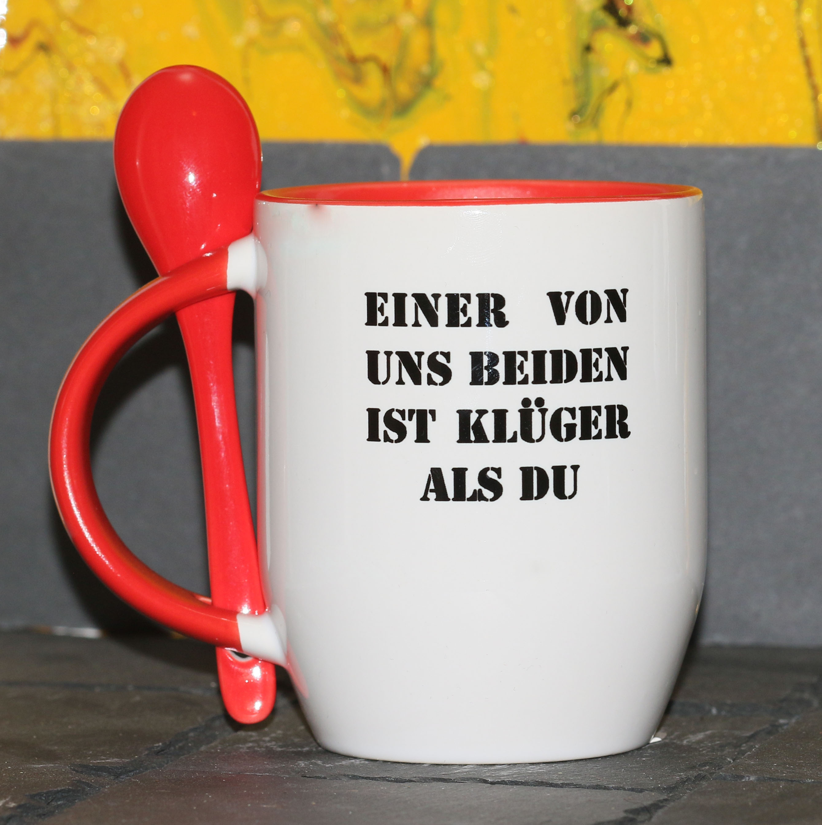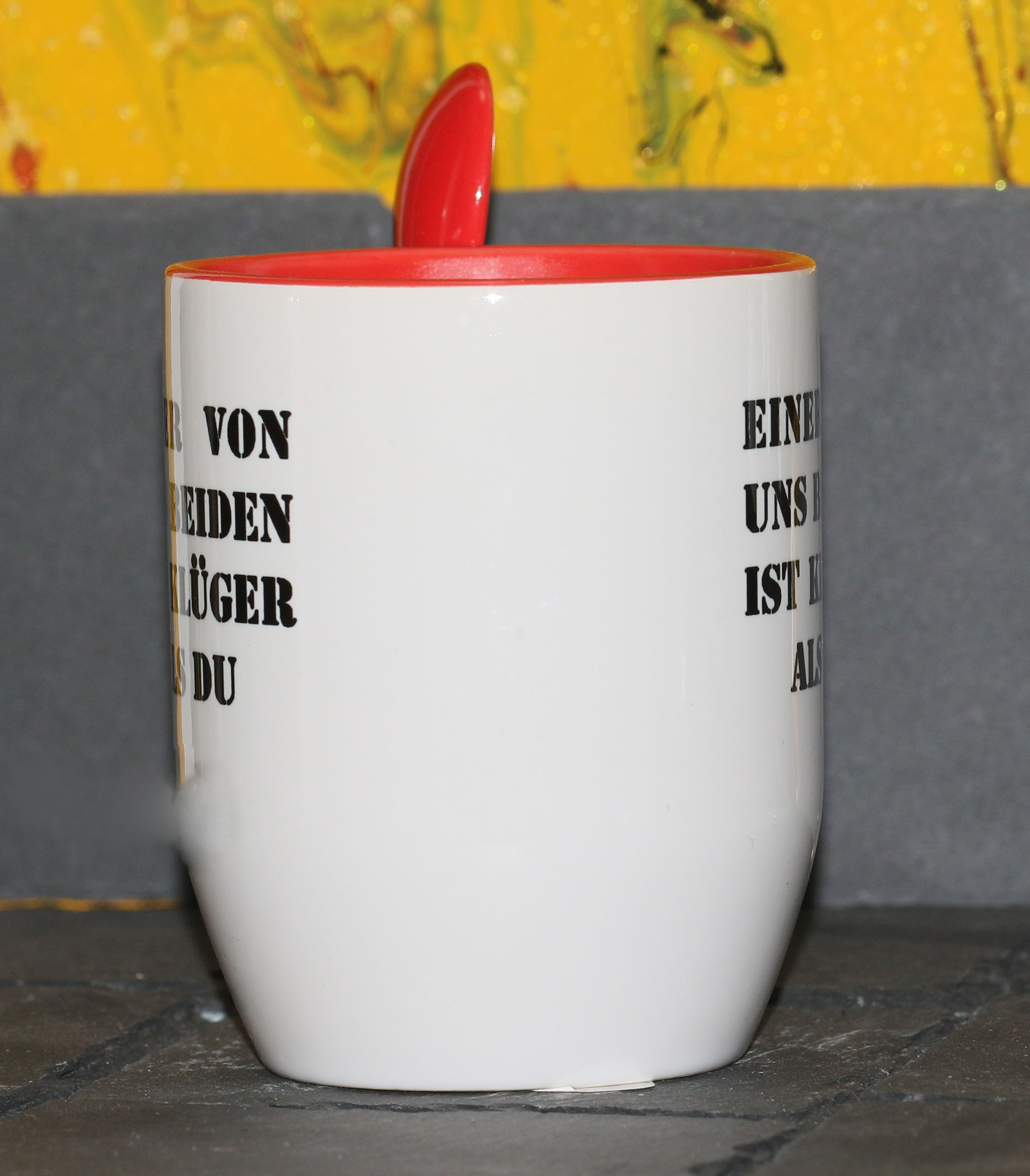 Suchst du nach einem Geschenk, das sowohl humorvoll als auch ein wenig frech ist Unsere Tasse mit dem Spruch **"EINER VON UNS BEIDEN IST KLÜGER ALS DU!" ** ist perfekt für alle, die einen guten Sinn für Ironie und Wortwitz haben.