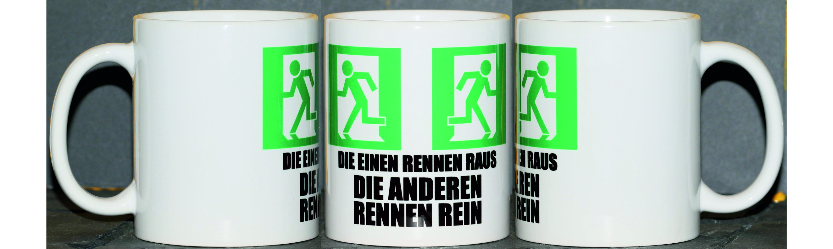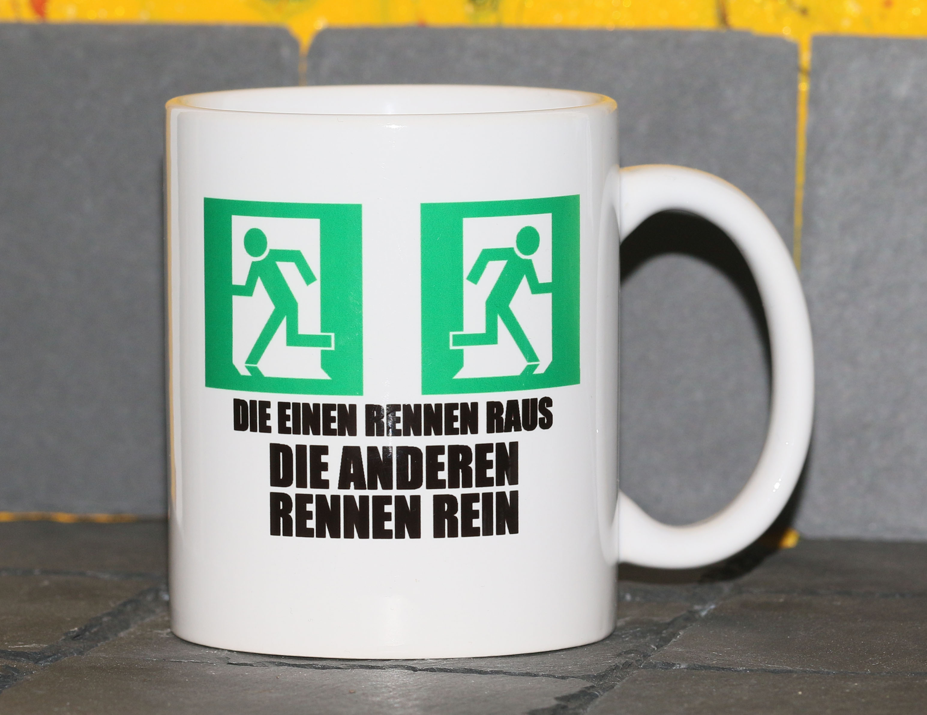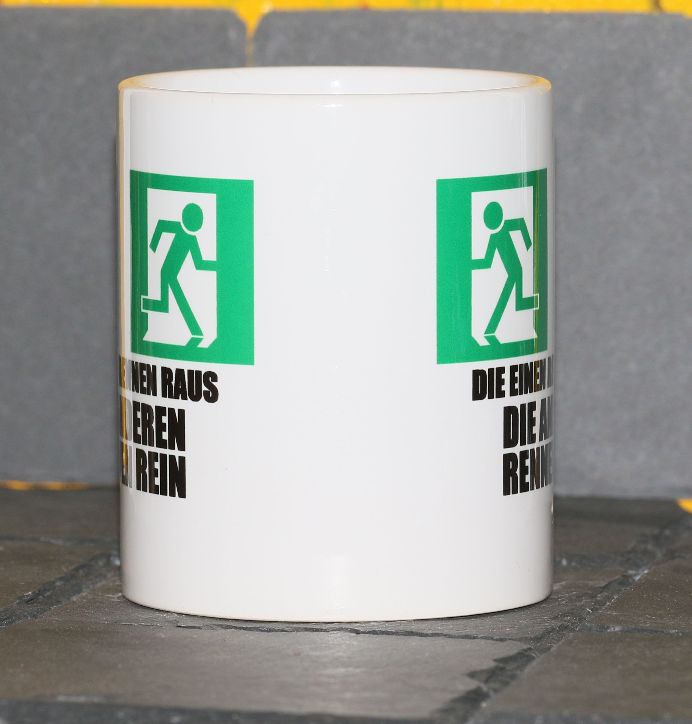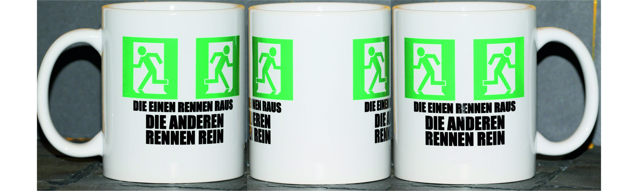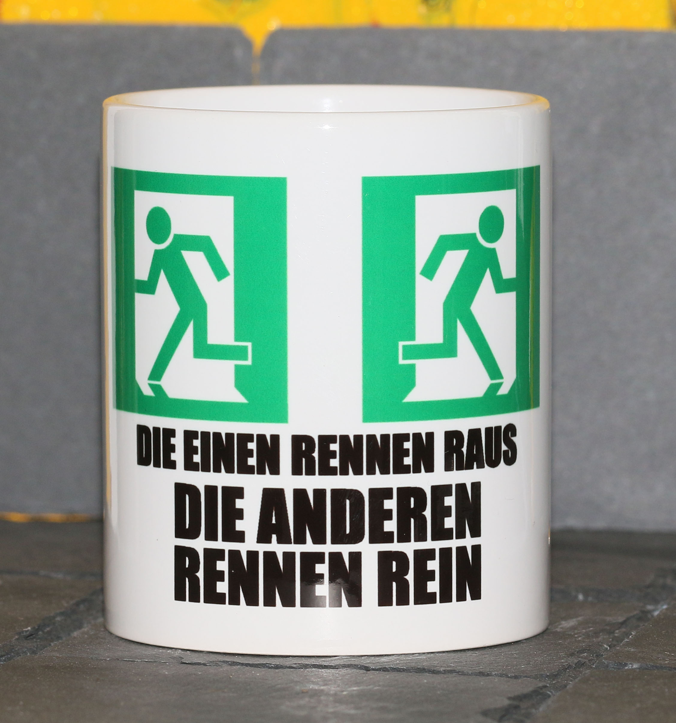 Suchst du nach einem Geschenk, das sowohl humorvoll als auch ein wenig frech ist Unsere Tasse mit dem Spruch **"DIE EINEN RENNEN RAUS DIE ANDEREN RENNEN REIN"** ist perfekt für alle, die einen guten Sinn für Ironie und Wortwitz haben.