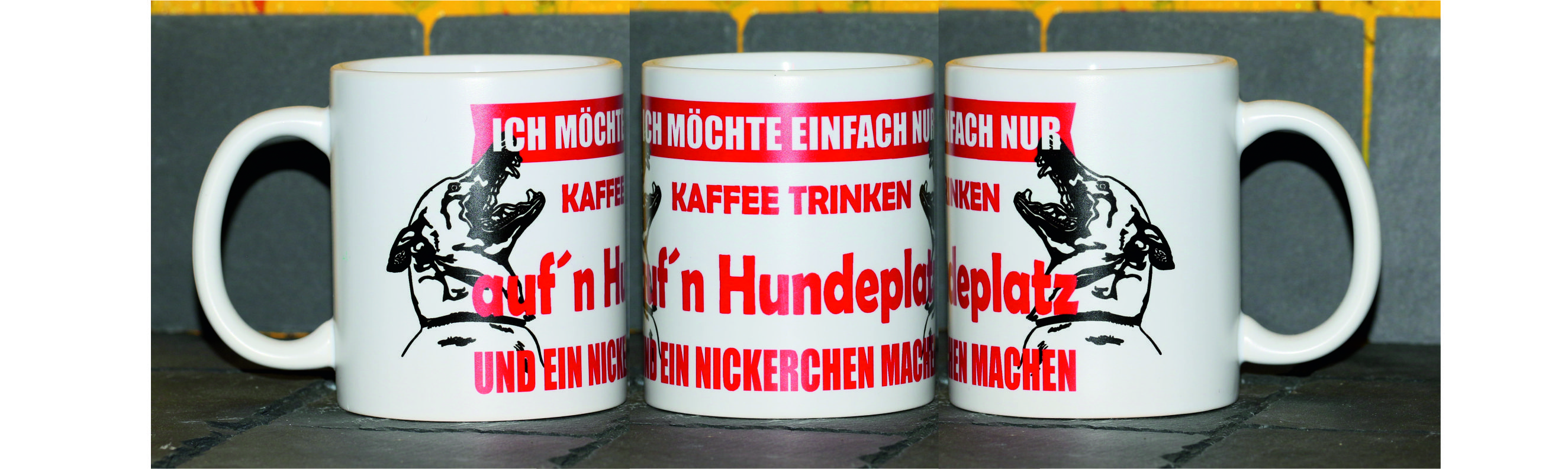 "ICH MÖCHTE NUR KAFFEE UND AUF´N HUNDEPLATZ"Die leuchtenden Farben und individuellen Designs unserer Tassen sind eine Bereicherung für jeden Kaffeetisch. Mit einer Vielzahl an Größen und Stilen, von klassisch bis modern, ist für jeden Geschmack und jede Gelegenheit das Richtige dabei.