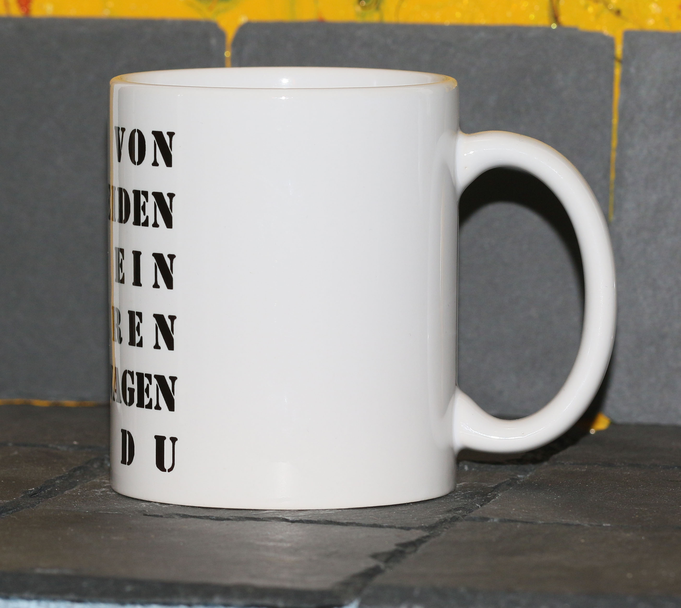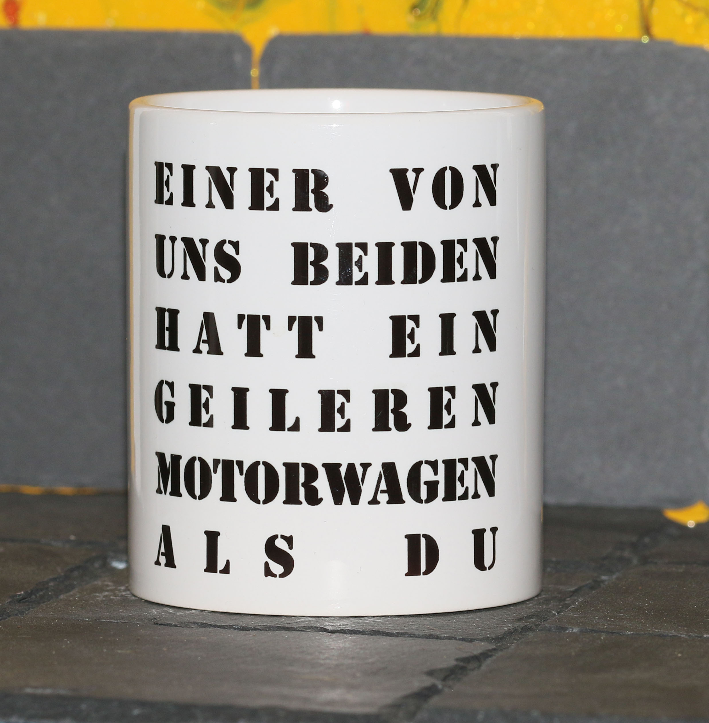 Weiße Tasse mit Spruch "EINER VON UNS BEIDENHATT EIN GEILEREN MOTORWAGEN ALS DU!"