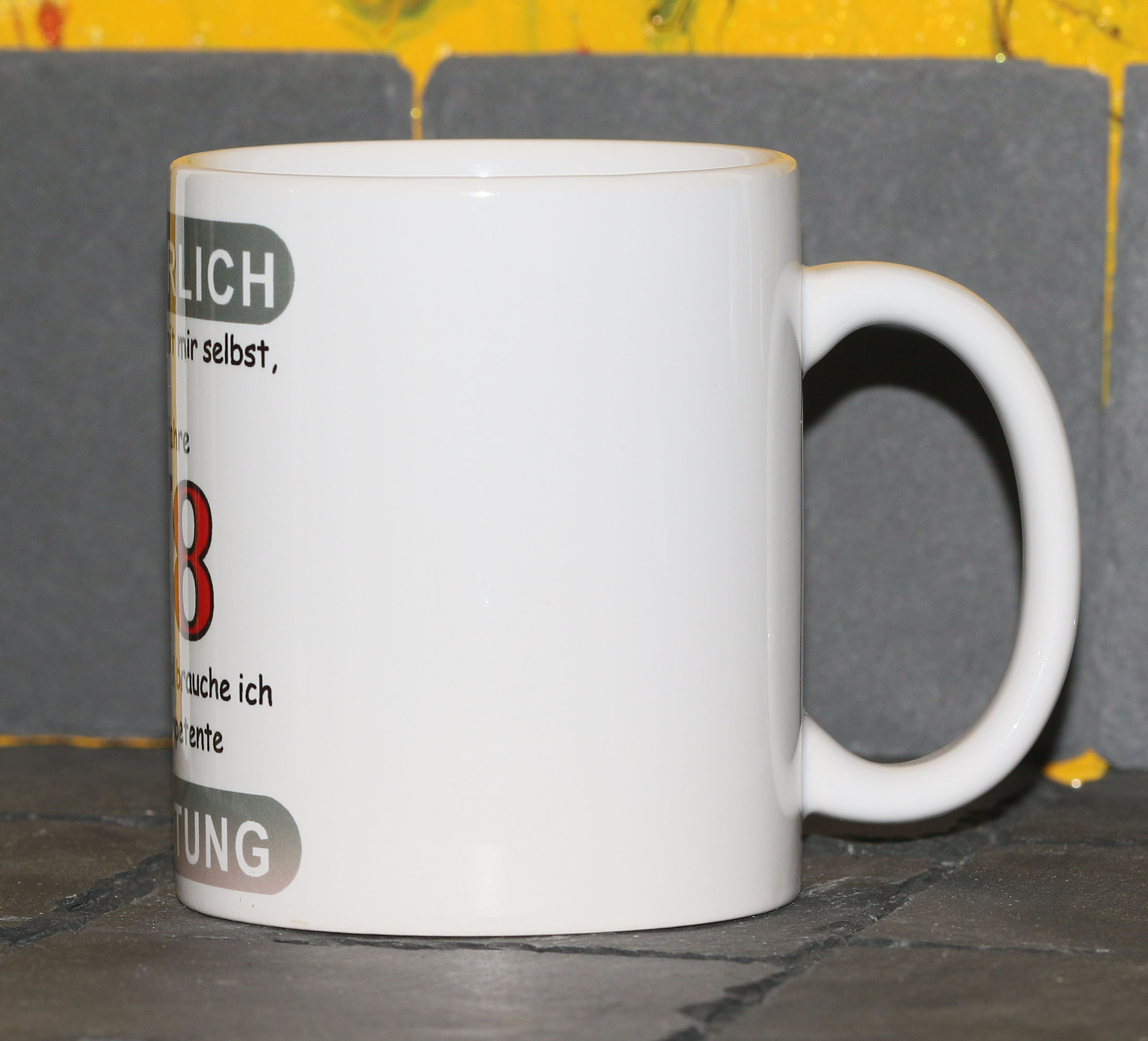 Einzigartiges Design für Humorliebhaber. Diese Tasse ist nicht nur ein praktisches Utensil für den täglichen Kaffeegenuss, sondern auch ein Statement für alle, die Spaß verstehen und schätzen. Verleihe deinem Morgenkaffee oder Nachmittagstee eine Prise Humor und lasse andere schmunzeln, wenn sie deinen Becher sehen. Hochwertige Qualität Gefertigt aus robustem Keramikmaterial, ist die Tasse sowohl mikrowellen- als auch spülmaschinenfest (Handwäsche empfohlen). Die ORCA-Beschichtung sorgt dafür, dass die Farben lebendig und der Druck hochwertig bleiben. Das perfekte Geschenk ob für einen Freund, Kollegen oder einen geliebten Menschen – diese Tasse ist eine ausgezeichnete Wahl, um für Lacher und Überraschung zu sorgen. Ideal für Geburtstage, Valentinstag, Weihnachten, Nikolaus oder einfach als kleine Aufmerksamkeit zwischendurch. So einfach geht's:1. Wähle deine gewünschte Menge 2. Lege alles in den WarenkorbWir kümmern uns um den Rest. Die Tasse wird sorgfältig bedruckt und sicher verpackt ?, um eine unbeschädigte Lieferung zu gewährleisten.