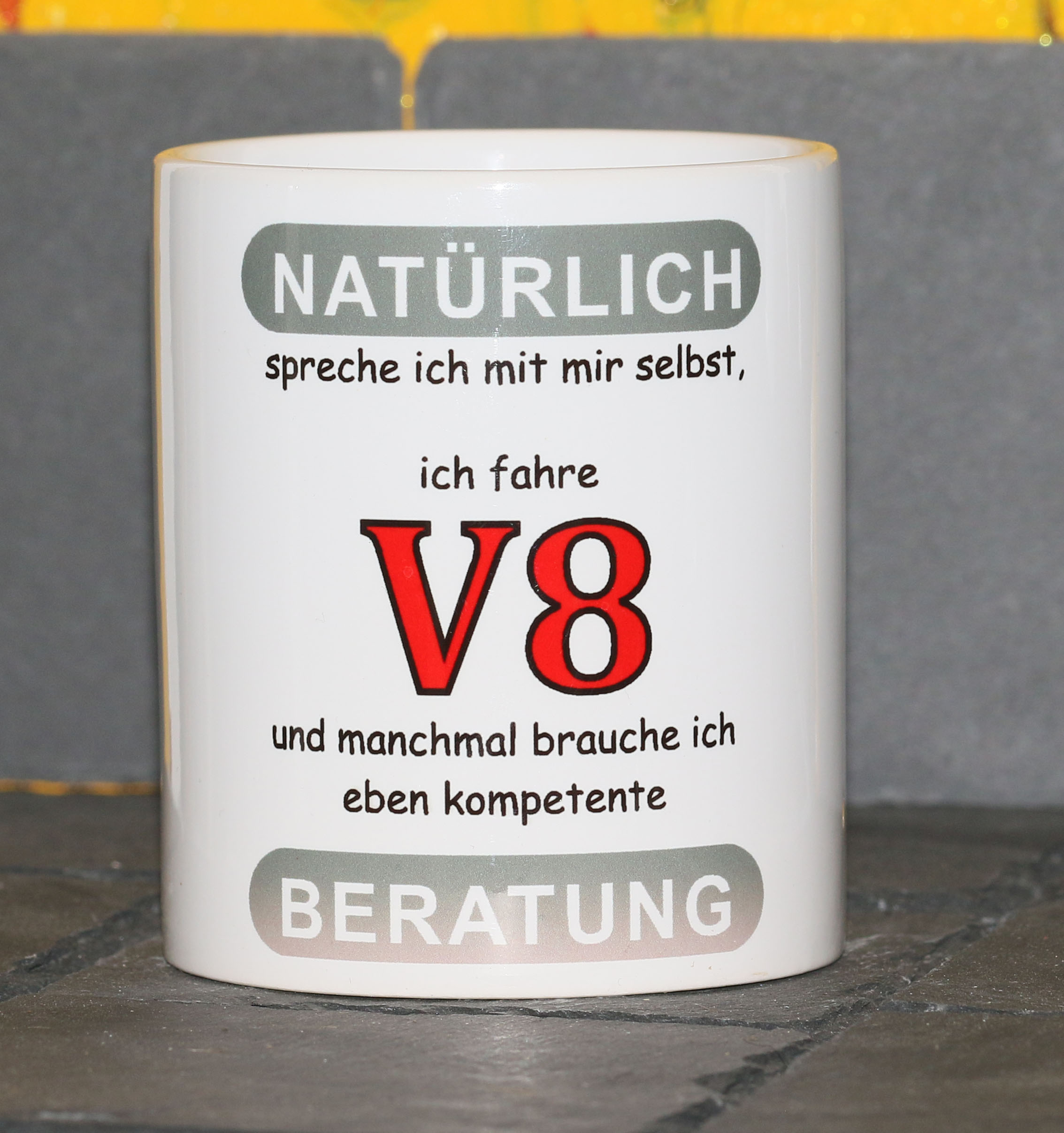 Suchst du nach einem Geschenk, das sowohl humorvoll als auch ein wenig frech ist Unsere Tasse mit dem Spruch ** "NATÜRLICH SPRECHE ICH MIT MIR SELBST, ICH FAHRE V8; UND MANCHMAL BRAUCH ICH KOMPETENTE BERATUNG"** ist perfekt für alle, die einen guten Sinn für Ironie und Wortwitz haben.