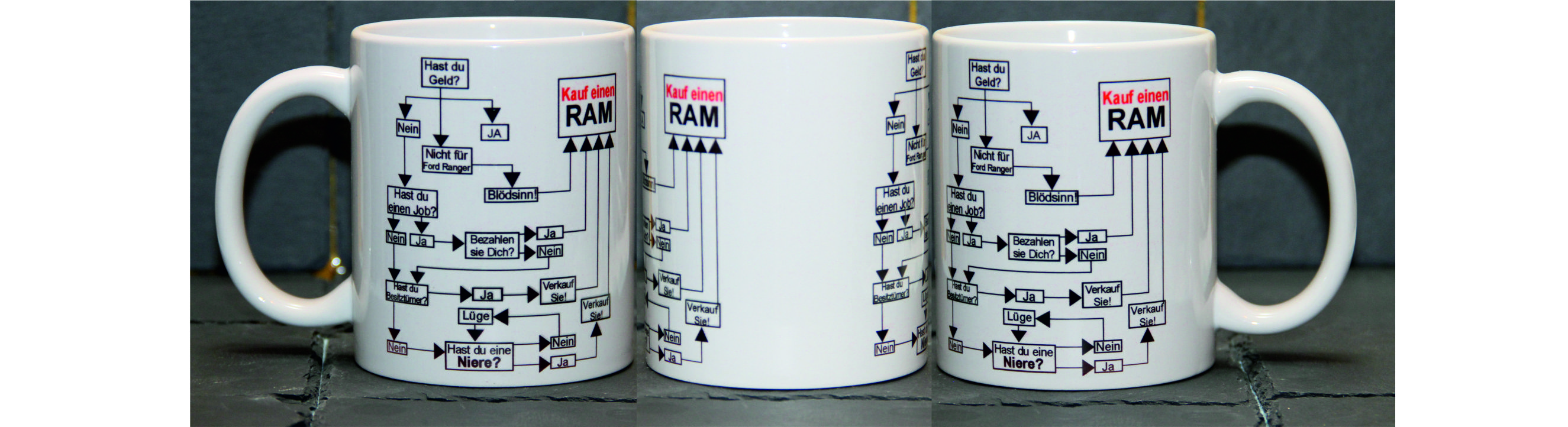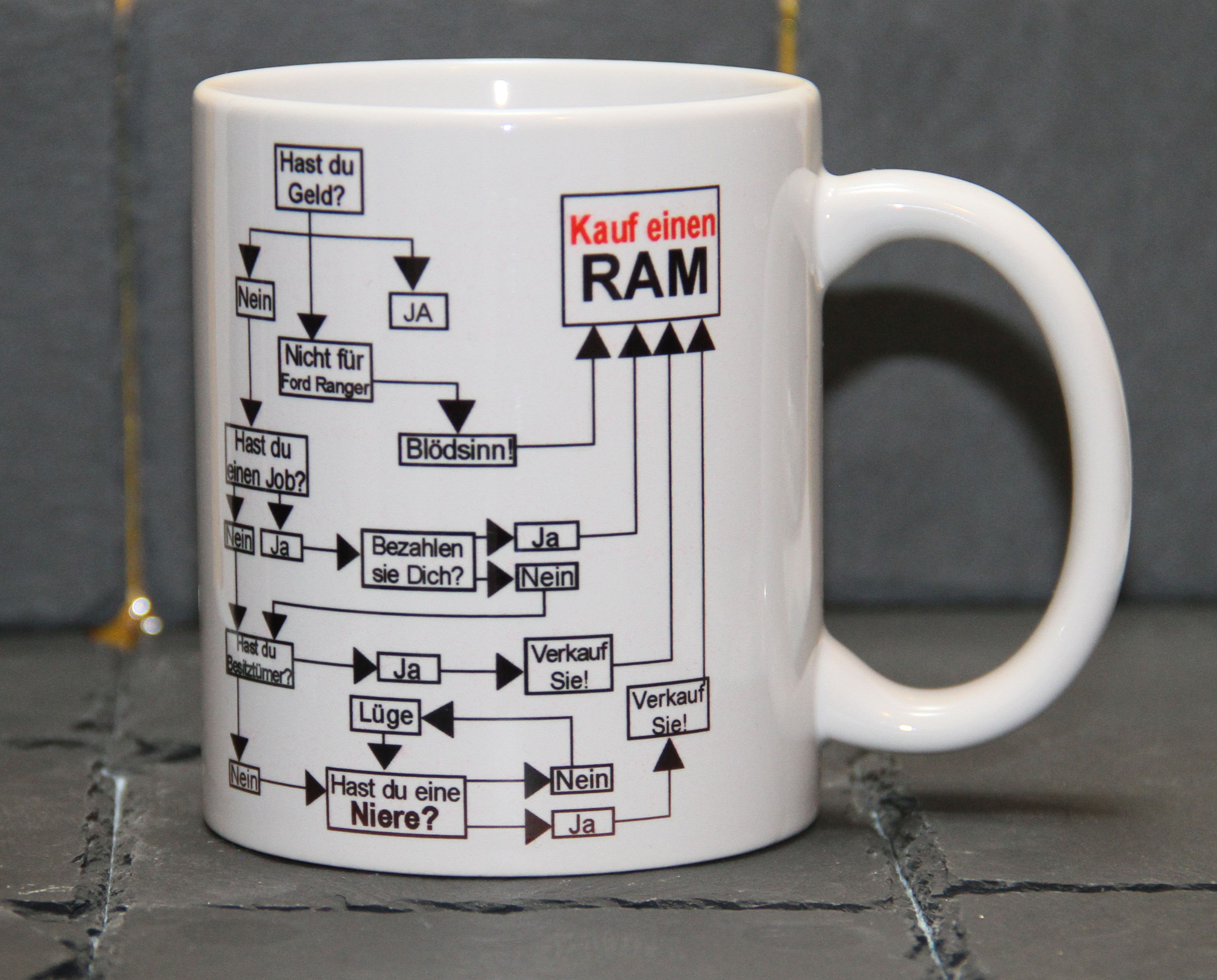 Weiße Tasse mit Spruch "GRÜNDE EINEN RAM ZU KAUFEN"
