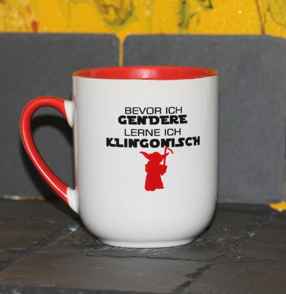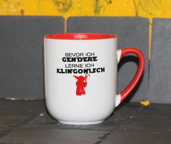 Suchst du nach einem Geschenk, das sowohl humorvoll als auch ein wenig frech ist Unsere Tasse mit dem Spruch **"BEVOR ICH GENDERE LEHRNE ICH KLINGONISCH"** ist perfekt für alle, die einen guten Sinn für Ironie und Wortwitz haben.